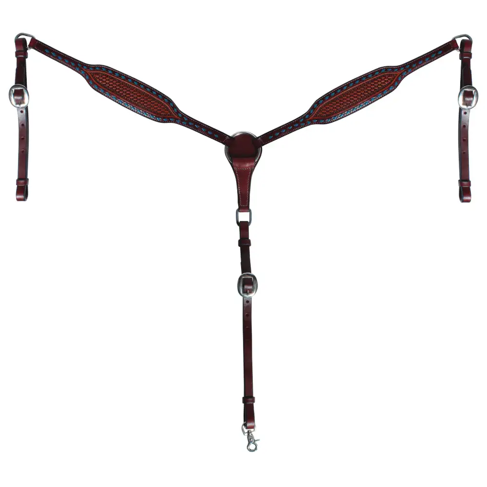 Blue buck stitching and turquoise accented feather buckles take classic basketweave tooling to a new level.