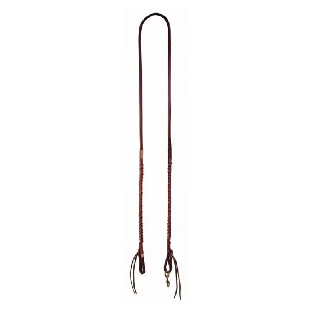 Unique “bleeding heart” double plaited front 5/8″ roping rein with solid brass snaps.