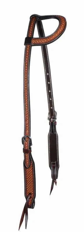Hand-tooled headstall with reptile-like pattern. Stainless steel buckles and lace ties. Cheeks are turned out for a great look and smooth fit against the horse.