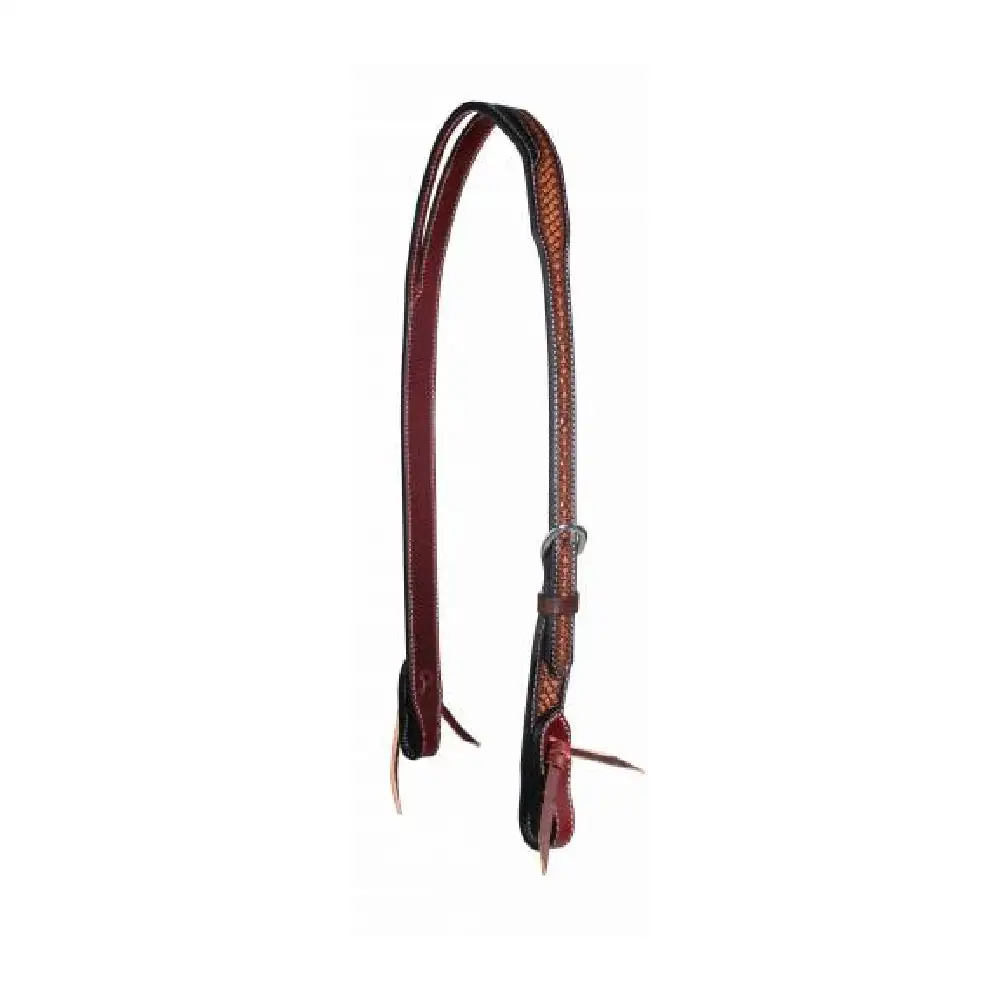 Hand-tooled headstalls with reptile-like pattern. Stainless steel buckles, lace ties. Cheeks are turned out for a great look and smooth fit against the horse.