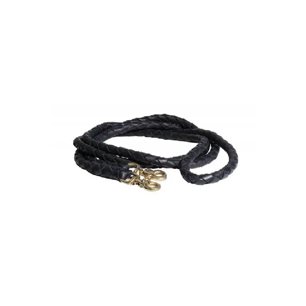 Round braided leather roping reins feature braided in brass scissor snaps at both ends. Available in black or chocolate brown. Over 8 feet long.