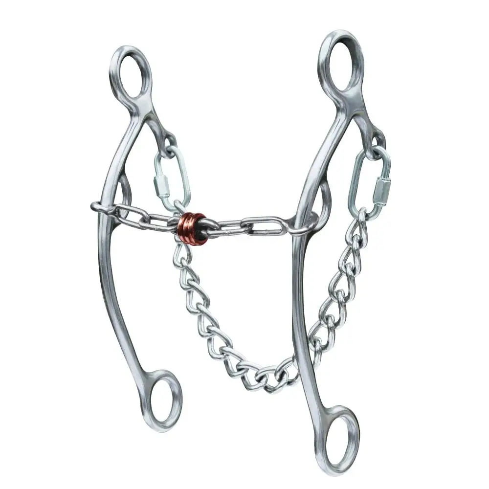 A unique curve to the cheek as well as forward set headstall rings and a backset curb chain attachment cause a quick reaction with lift and collection. The snaffle is made of 3/8” sweet iron material. The mouthpiece is a four-break chain with a center link interrupting the continual pressure across the mouth. This allows for more intensity on the outside pressure points. The copper center loose rollers aid in keeping the mouth moist.