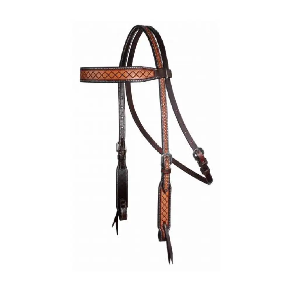 Eye-catching crosshatch tooling pattern set off with a dark border. Cheeks are turned out for a smooth fit against the horse. Stainless steel hardware, lace ties.