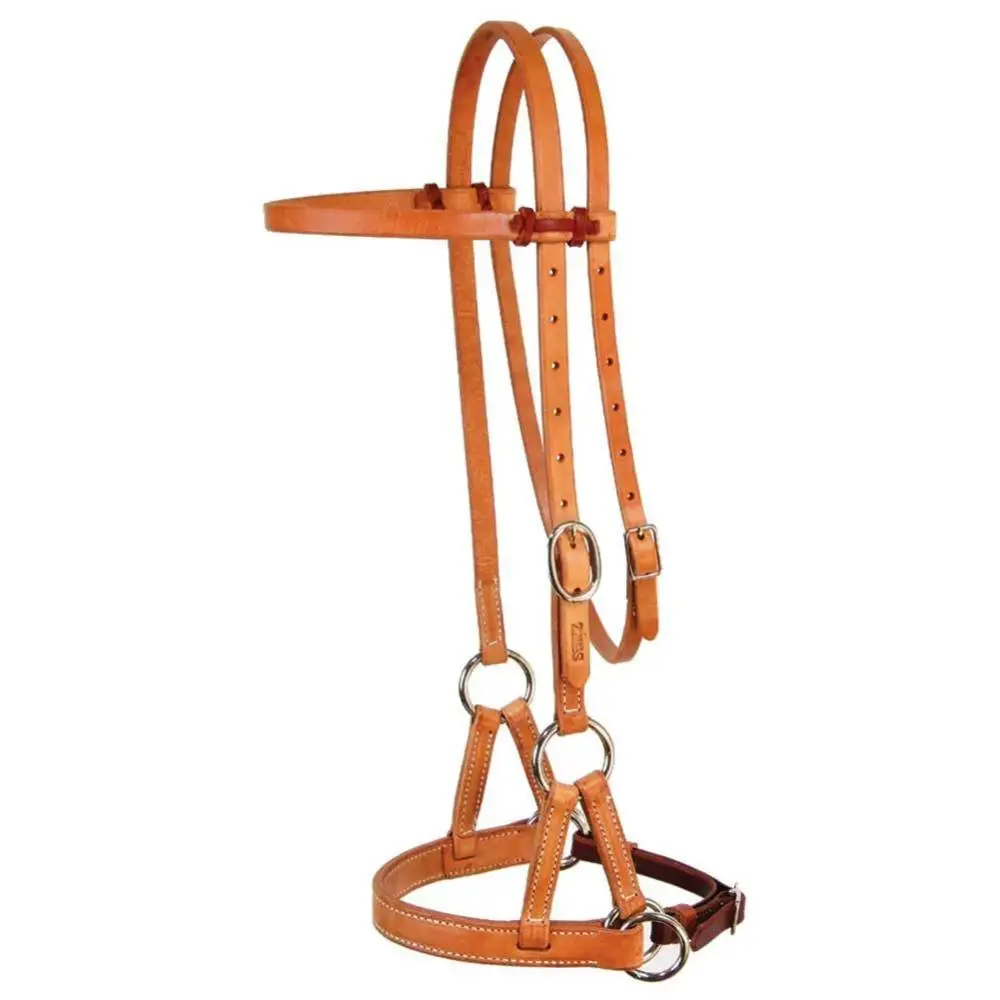 Harness leather headstall with doubled and stitched flat noseband, latigo chin strap. Hermann Oak Leather, Made in the USA.