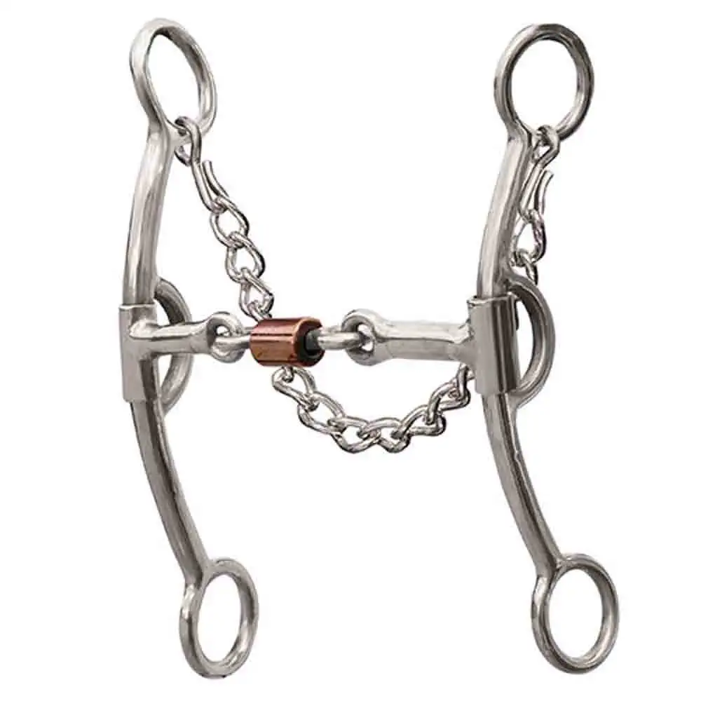 The three piece smooth dog-bone with a copper roller mouthpiece is comfortable as it lies across the tongue. The smooth bars offer a softer feel. Copper roller provides entertainment for a busy horse and promotes salivation.
