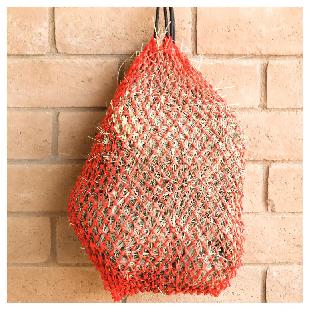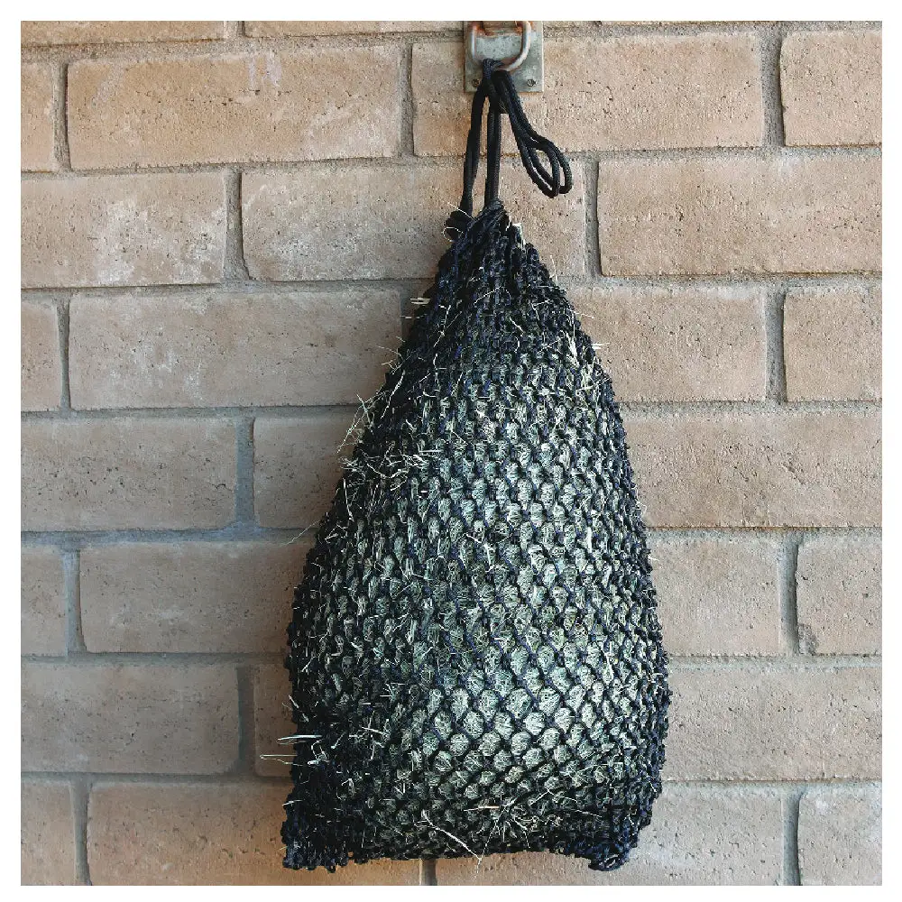Slow feed hay net with 1″ holes to encourage slower eating. Heavy duty rope to hang at desired height.Â