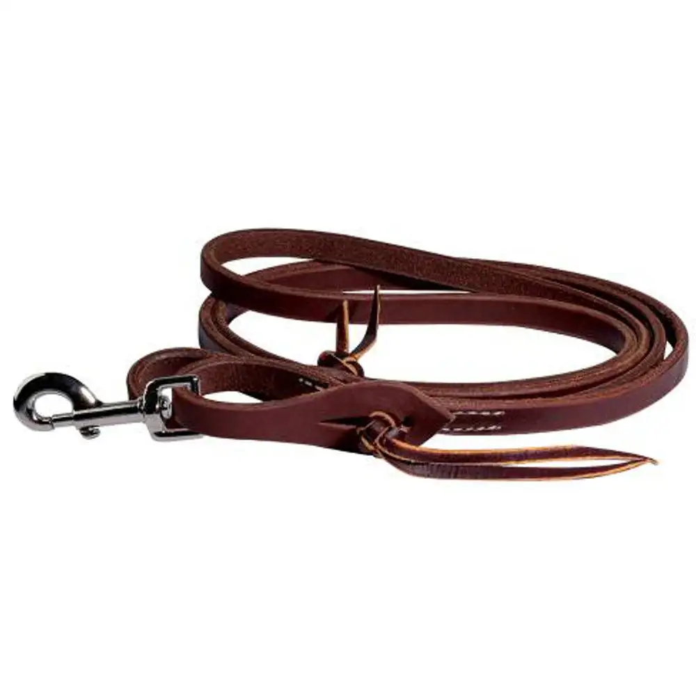 Ranch Collection harness leather roping reins have a scalloped quick-change pineapple knot loop and a unique heavy oil dressing that gives a great feel right out of the box. Nickel plated bolt snaps.