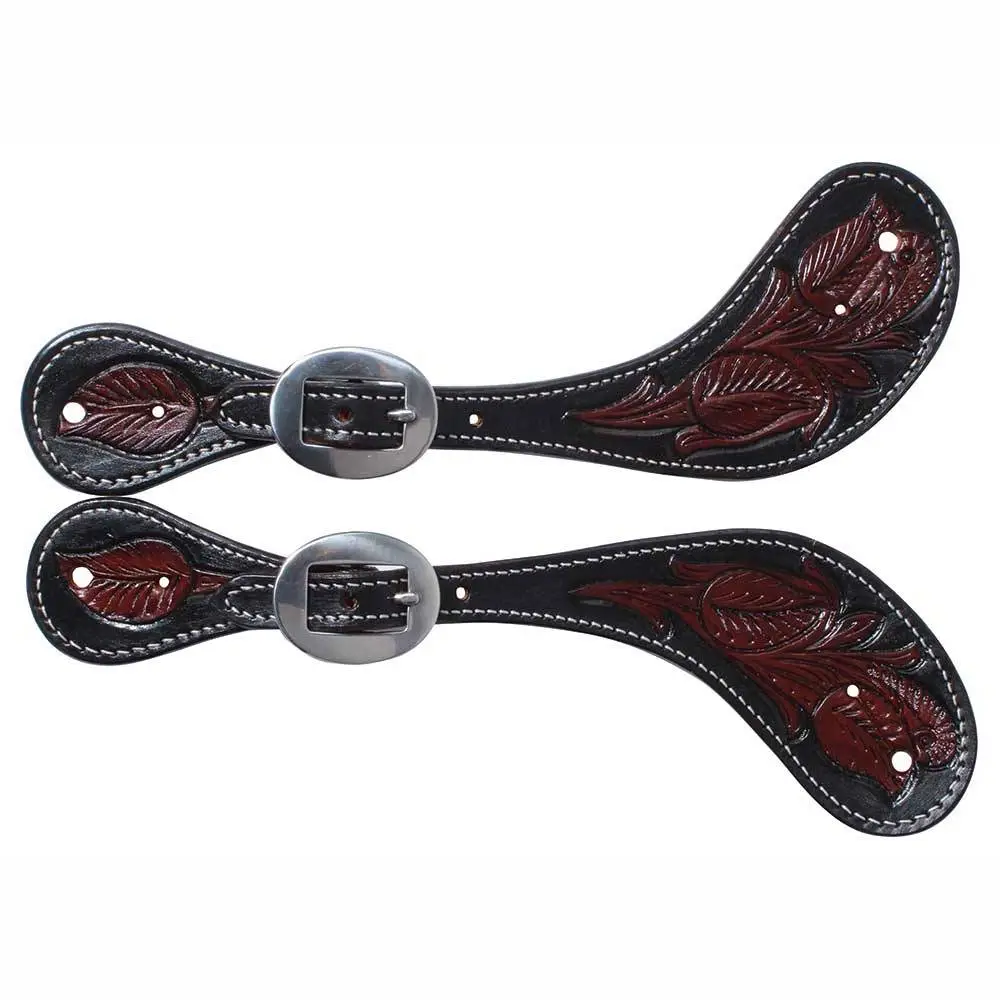 black leather with chocolate brown floral tooling, feature stainless steel hardware