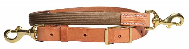 Heavy Hermann Oak Harness leather tie down with unique polyester coated rubber insert for the optimum amount of stretch to keep the horse comfortable and working at it’s best. Brass hardware and lots of adjustment holes.