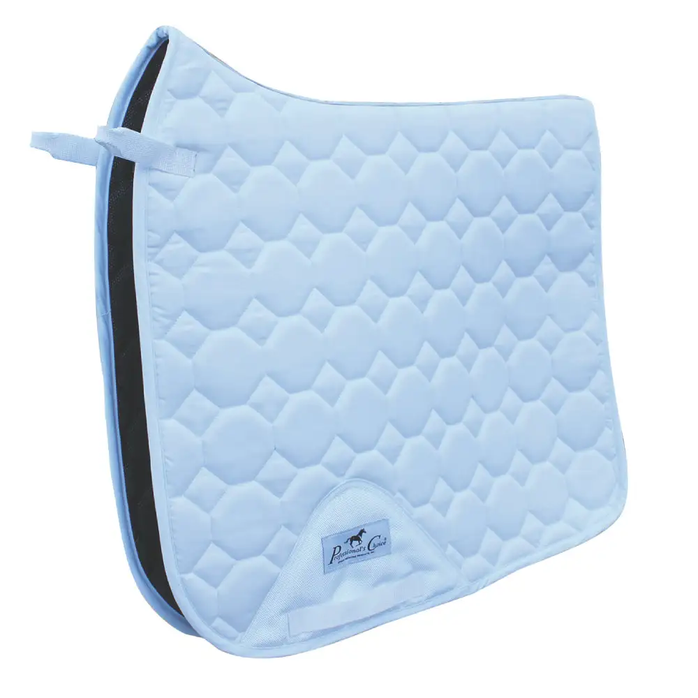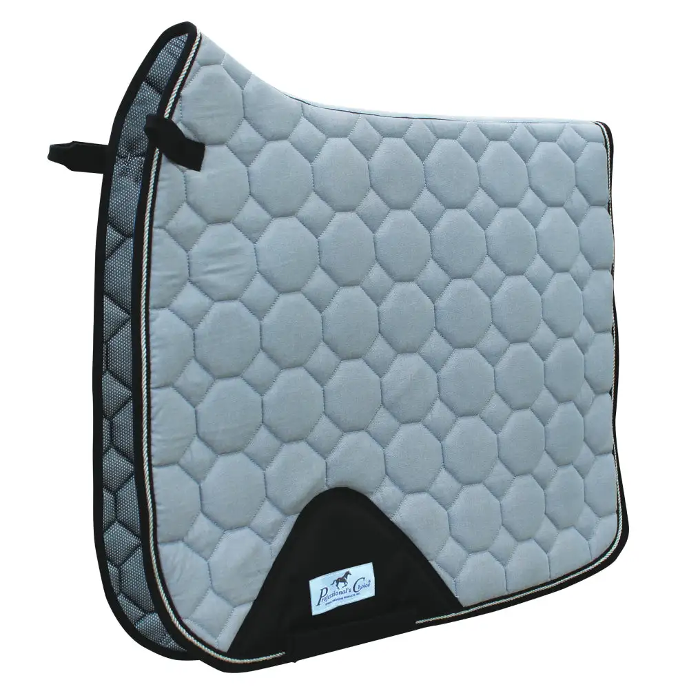 The Professional’s Choice VenTECH® Dressage pad combines the latest technical materials while maintaining a traditional appearance. The quilted cotton top layer is stain resistant while the VenTECH mesh lining is absorbent, quick drying, extremely breathable and lightweight, and antimicrobial so it will not harbor bacteria. The pad also features reinforced ballistic billet guards for extra durability. The pad is designed with a contoured back for wither clearance and correct fit, keeping the pad securely in place. Webbed D-Ring straps feature hook and loop for easy application.