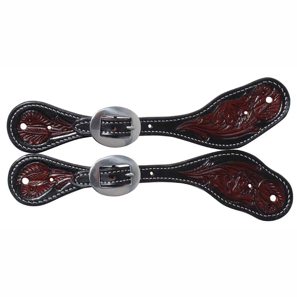 black leather with chocolate brown floral tooling, feature stainless steel hardware.
